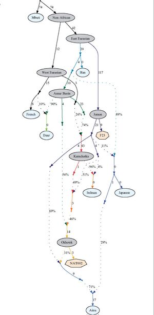 Studies on modern-day Ainu estimate that they derive between 66% to 79.3% ancestry from the Jōmon lineage.[81][82] Another study on modern Ainu individuals found that they derive c. 49% of their ancestry directly from the Jōmon people, c. 22% from the Okhotsk people (who themself could be modeled as 54% Ancient Northeast Asian, 22% Ancient Paleo-Siberian, and 24% Jōmon), and ~29% from the Yamato Japanese (who carried around 11% Jōmon and 89% Yayoi ancestry), corresponding with historical events.[66]