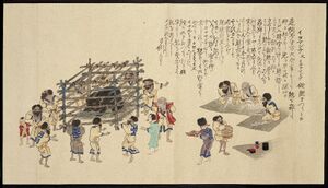The Ainu went from being a relatively isolated group of people to have their land, language, religion, and customs assimilated into those of the Japanese.[32] Their land was distributed to the Yamato Japanese settlers to create and maintain farms in the model of Western industrial agriculture. It was known as "colonization" (拓殖) at the time, but later by the euphemism, "opening up undeveloped land" (開拓).[33] Additionally, factories like flour mills and beer breweries, along with mining practices, resulted in the creation of infrastructure such as roads and railway lines during a development period that lasted until 1904.[34] During this time, the Ainu were ordered to cease religious practices such as animal sacrifice and the custom of tattooing.[35] The same act applied to the native Ainu on Sakhalin after its annexation as the Karafuto Prefecture.[36]