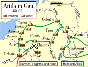 وفي عام 450 زحف أتلا ومعه نصف مليون رجل على نهر الراين، ونهبوا تريير ومتز Metz وأحرقوها وقتلوا أهلها. فقذف ذلك الرعب في قلوب غالة كلها فقد علموا أن الغزاة ليس على رأسهم جندي متمدين كقيصر، أو مسيحي -ولو كان من أتباع أريوس- مثل ألريك أو جيسريك، بل كان الزاحف عليهم هو الهوني الرهيب، سقوط الله المبعوث لعذاب المسيحيين والوثنيين على السواء لما هنالك من فرق شاسع بين أقوالهم وأعمالهم. وجاء ثيودريك الأول Theadoric I ملك القوط المعمر لينقذ الإمبراطورية من محنتها وانضم إلى الرومان بقيادة إيتيوس، والتقت الجيوش الضخمة في حقول قطلونيا Catalaunia بالقرب من ترويس، ودارت بينها معركة من أشد معارك التاريخ هولاً، جرت فيها الدماء انهاراً، حتى ليقال إن 162.000 رجل قد قتلوا فيها من بينهم ملك القوط البطل المغوار؛ وانتصر الغرب في هذه المعركة نصراً غير حاسم، فقد تقهقر أتلا بانتظام، وأنهكت الحرب الظافرين، أو لعلهم كانوا منقسمين على أنفسهم في خططهم، فلم يتعقبوا أتلا وجنوده ولهذا غزا إيطاليا في العام التالي.