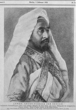 "أحمد الشريف، شيخ الطريقة السنوسية بعد قتال عنيف احتلت القوات الاستعمارية الإيطالية واحة الكفرة آخر قاعدة للمقاتلين السنوسيين، ليبيا كلها الآن بيد الإيطاليين"
