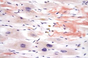 Micrograph demonstrating amyloid deposition (red-orange) with Congo red staining in cardiac amyloidosis