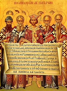 Icon depicting the Emperor Constantine and the bishops of the First Council of Nicaea (325) holding the Niceno–Constantinopolitan Creed of 381.