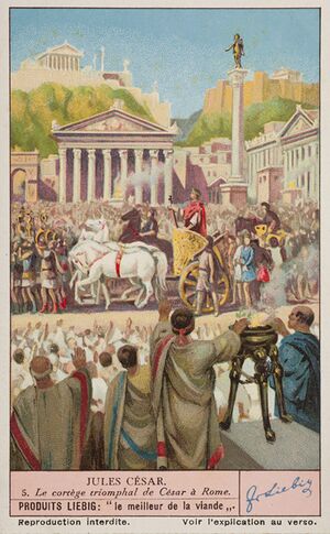 Because it was extremely tedious to make, Tyrian purple was expensive: the 4th century BC historian Theopompus reported, "Purple for dyes fetched its weight in silver at Colophon" in Asia Minor.[8] The expense meant that purple-dyed textiles became status symbols, whose use was restricted by sumptuary laws. The most senior Roman magistrates wore a toga praetexta, a white toga edged in Tyrian purple. The even more sumptuous toga picta, solid Tyrian purple with gold thread edging, was worn by generals celebrating a Roman triumph.[4]