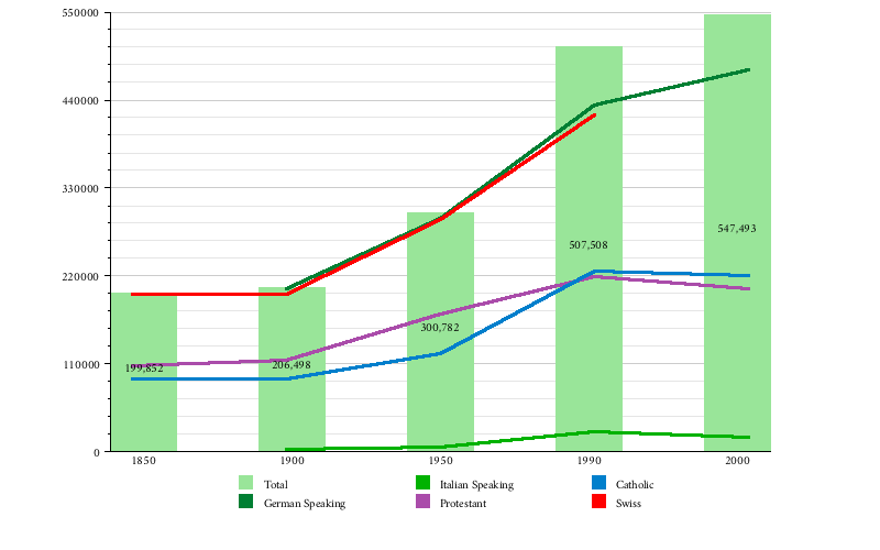 From the 2000 census[تحديث], 219,800 or 40.1% were Roman Catholic, while 189,606 or 34.6% belonged to the Swiss Reformed Church. Of the rest of the population, there were 11,523 members of an Orthodox church (or about 2.10% of the population), there were 3,418 individuals (or about 0.62% of the population) who belonged to the Christian Catholic Church, and there were 29,580 individuals (or about 5.40% of the population) who belonged to another Christian church. There were 342 individuals (or about 0.06% of the population) who were Jewish, and 30,072 (or about 5.49% of the population) who were Muslim. There were 1,463 individuals who were Buddhist, 2,089 individuals who were Hindu and 495 individuals who belonged to another church. 57,573 (or about 10.52% of the population) belonged to no church, are agnostic or atheist, and 15,875 individuals (or about 2.90% of the population) did not answer the question.[25]