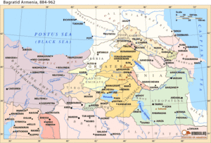 Despite his status, Ashot remained a subordinate to the Caliph and was put under the supervision of the emirs of Azerbaijan.[26] Every Armenian prince fell under Ashot's authority (though in the effect of primus inter pares[27]). Dvin and the emirates of Manazkert and Karin (and, according to Constantine VII, Khoy and Salmas)[28] also fell under Ashot's control, despite the local governments' unwillingness to accept.[26] The emir of Manazkert was in this way defeated and was forced to submit to Ashot's rule in 885.[29]