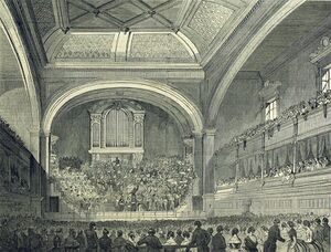 The organisation was founded for the rich and élite members of Liverpool society, for "the pleasure of the moneyed merchant class in the town".[6] Its first concert was given on 12 March 1840 in a room at the back of a dance academy in Great Richmond Street and was conducted by John Russell with William Sudlow as organist. The programme consisted of 13 short orchestral and choral pieces, including works by Auber, Rossini, Spohr, Henry Bishop, and George Onslow, and madrigals by Thomas Morley and John Wilbye.[7] The society outgrew this room and gave its performances in the hall of the Collegiate Institution in Shaw Street. In 1843 the society appointed its first principal conductor, the Swiss-born J. Zeugheer Herrmann, who continued in this role until his death in 1865.[6] During the following year, the orchestra performed its first symphonies, Haydn's No. 99 and Beethoven's First.[8]