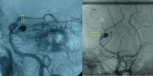 تشريح الشرايين ما بعد الانسداد تظهر تمدد الأوعية الدموية الملفوفة (المشار إليها بواسطة الأسهم الصفراء) من الشريان المخي الخلفي مع كيس أم الدم المتبقي.
