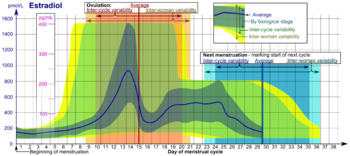 Reference ranges for the blood content of estradiol, the primary type of estrogen, during the menstrual cycle.[1]