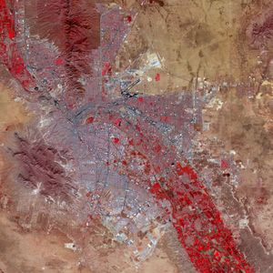 False colour satellite image of El Paso and Ciudad Juárez. Paved streets and buildings appear in varying shades of blue-gray, and red indicates vegetation. Image courtesy of NASA.