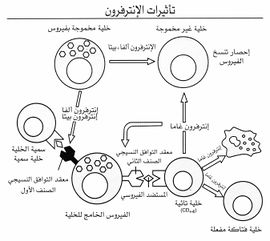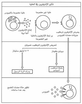 والإنترفرون عاجز عن تعطيل الجزيئات الفيروسية مباشرة أو إبطال مفعولها. وينحصر تأثيره في دورة نسخ الفيروس التي تتم بوساطة الخلية المضيفة. فالإنترفرونات تتصل بمستقبلات نوعية موجودة على سطح معظم الخلايا. وهناك مستقبلات لألفا وبيتا وأخرى لغاما. والتأثير المتبادل بين الإنترفرون والمستقبل يسبب تحريض عدة جينات تعمل على إفراز إنظيمات تتدخل في الآلية التي يستخدمها الفيروس لنسخه. وأهم هذه الإنظيمات اثنان هما: