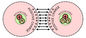The electrostatic force caused by positively charged nuclei are very strong over long distances, but at short distances the nuclear force is stronger. As such, the main technical difficulty for fusion is getting the nuclei close enough to fuse. Distances not to scale.