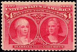 كلومبس يطلب العون من إيزابلا وفرديناند ~ اصدار الولايات المتحدة في 1893 ~ -- إيزابلا إلى اليمين على رأس المائدة. فرديناند يرتدي قبعته المميزة ويجلس بجانب كلومبس، الواقف. [1]