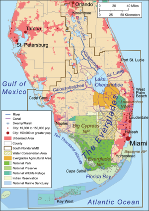 Southern third of the Florida Peninsula, showing the area managed by the South Florida Water Management District, Lake Okeechobee, the Everglades, Big Cypress National Preserve, the South Florida Metropolitan Area, the العشرة آلاف جزيرة وخليج فلوريدا.