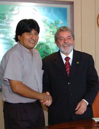 Morales' administration sought strong links with the far-left governments of Cuba and Venezuela.[115] In April 2005 Morales traveled to Havana for knee surgery, there meeting with the two nations' presidents, Castro and Chávez.[116] In April 2006, Bolivia agreed to join Cuba and Venezuela in founding the Bolivarian Alternative for the Americas (ALBA), with Morales attending ALBA's conference in May, at which they initiated with a Peoples' Trade Agreement (PTA).[117] Meanwhile, his administration became "the least US-friendly government in Bolivian history".[118] In September Morales visited the U.S. for the first time to attend the UN General Assembly, where he gave a speech condemning U.S. President George W. Bush as a terrorist for launching the War in Afghanistan and Iraq War, and called for the UN Headquarters to be moved out of the country. In the U.S., he met with former presidents Bill Clinton and Jimmy Carter and with Native American groups.[119] Relations were further strained between the two nations when in December Morales issued a Supreme Decree requiring all U.S. citizens visiting Bolivia to have a visa.[120] His government also refused to grant legal immunity to U.S. soldiers in Bolivia; hence the U.S. cut back their military support to the country by 96%.[112]
