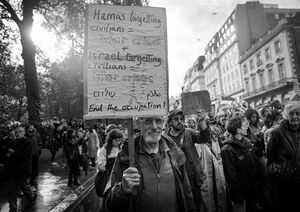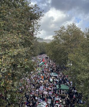 In the following weeks during Israel's counterattacks on Gaza, a number of pro-Palestine vigils, rallies and marches were held throughout the UK. On 9 October, the Stop the War Coalition and Palestine Solidarity Campaign (PSC) attended a demonstration in which hundreds marched through London's Kensington High Street and outside the embassy of Israel. Demands were made for an "Intifada revolution". PSC said in a statement that Hamas's attack had to be understood in the context of decades of Israeli occupation and, for an end to violence from Israel and Palestinians, the root cause, Israeli apartide, needed to end.[1][2] Three people were arrested at the protest.[1] The largest demonstrations were held in London, with people from across the country in attendance: thousands marched on 15 October 2023,[3] 100,000 on 21 October,[4] 70,000 on 28 October,[5] 30,000 on 4 November[6] and 300,000 on 11 November.[7] The 11 November march was one of the largest in the UK in years,[8][9] with some estimating it was the largest since the 2003 protest against the invasion of Iraq.[10]