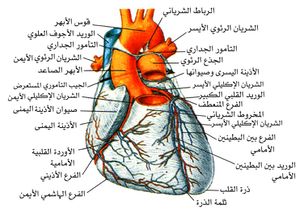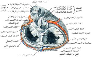 سطح القلب الأمامي والفروع الرئيسية للعروق الإكليلية. يقع السهم في الجيب المستعرض للتأمور
