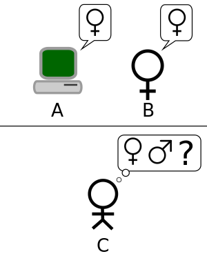 لعبة التقليد، كما وصفها آلان تورنگ في "الحوسبة الآلية والذكاء". يحاول اللاعب C، من خلال سلسلة من الأسئلة المكتوبة، تحديد أي من اللاعبين الآخرين يكون رجلاً وأيهما تكون المرأة. يحاول اللاعب A، الرجل، خداع اللاعب C لاتخاذ قرار خاطئ، بينما يحاول اللاعب B مساعدة اللاعب C. الشكل مقتبس من سايجين، 2000.[7]