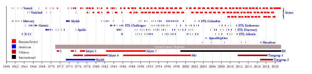 كان يوري هو أول إنسان يرتاد الفضاء، حيث حلق على متن مركبة الفضاء ڤوستوك 1، التي أطلقها الاتحاد السوڤيتي في في 12 أبريل 1961 كجزء من برنامج ڤوستوك. حلق البشر على سطح القمر تسع مرات من عام 1968 حتى 1972 ضمن برنامج أپولو الأمريكي، واستمر 19 عاماً و130 يوماً على محطة الفضاء الدولية.[1] جميع رحلات الفضاء البشرية كانت تحت قيادة بشرية، حيث تم البدء في تصميم أول مركبة فضائية ذاتية تحمل البشر في عام 2015.