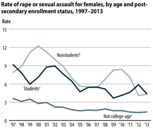 - الفتيات اللاتي تتراوح أعمارهن بين 16 إلى 19 عام أكثر تعرضا من عامة الناس بنسبة 4 مرات للاغتصاب والشروع في الاغتصاب والاعتداء الجنسي.[57]