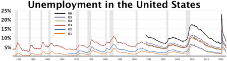 في مايو 2020، قدمت سي إن إن تحليلاً بناءً على بيانات البطالة التي تفيد بأن الاقتصاد الأمريكي ربما كان أسوأ ما كان عليه منذ الثلاثينيات.[110] بحلول 8 مايو، وصلت الولايات المتحدة إلى معدل بطالة قياسي بلغ 14.7 في المائة، مع خسارة 20.5 مليون وظيفة في أبريل.[111] حذر رئيس الاحتياطي الفدرالي الأمريكي، جروم پاول، من أن الأمر قد يستغرق "وقتًا طويلاً" قبل أن يتعافى الاقتصاد الأمريكي بالكامل من ضعف النمو الاقتصادي، بسبب الجائحة، وذلك في المستقبل المنظور. المستقبل يمكن أن تتوقع الولايات المتحدة "نمو إنتاجية منخفض وركود في الدخل".[112] بحلول 31 مايو 2020، تقدم أكثر من أربعين مليون أمريكي للحصول على إعانات البطالة.[113]