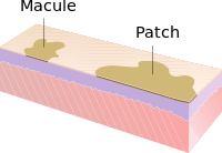 وهي الأمراض التي تتظاهر على الجلد بعناصر مرضية أولية تبدو على شكل بقع patchs أو لطخ macules أو وكت spots. ومن أهمها: