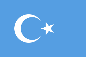 علم الأويغور الذي يشبه علم تركيا ولكن بخلفية زرقاء. تمنع حكومة الصين استخدام هذا العلم