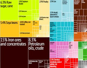 السلع التصديرية | الطائرات، الأسلحة، الصلب، الآلات، معدات النقل، السيارات، قطع غيار السيارات، المعدات الكهربائية، الأدوات المطبخية، النفط، الحديد شبه المصنع، خام الحديد، اللب (السليلوز)، فول الصويا، الذرة، لحم البقر، لحم الدجاج، لحم الخنزير، وجبات فول الصويا، السكر، البن، قصب السكر، التبغ، القطن، عصير البرتقال، الذهب، الإيثانول |