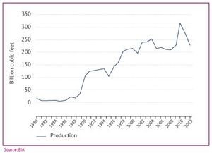 اكتشاف كميات كبيرة من الغاز استخدم قسم منها في محطات توليد الطاقة الكهربائية و بعض معامل الصناعات التحويلية