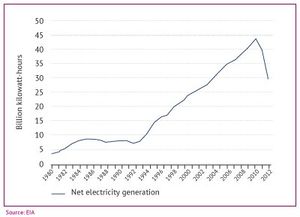 توليد الكهرباء، 1980-2012، مليار كيلوواط في الساعة. (المصدر: EIA)