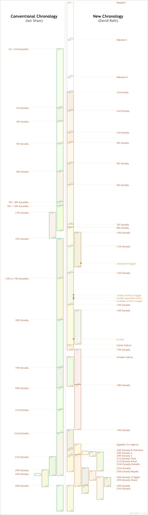 التأريخ الحديث New Chronology هو an alternative chronology of the ancient Near East developed by English Egyptologist David Rohl and other researchers[1][2] beginning with A Test of Time: The Bible - from Myth to History in 1995. It contradicts mainstream Egyptology by proposing a major revision of the established Egyptian chronology, in particular by re-dating Egyptian kings of the Nineteenth through Twenty-fifth Dynasties, bringing forward conventional dating by up to 350 years. Rohl asserts that the New Chronology allows him to identify some of the characters in the Hebrew Bible with people whose names appear in archaeological finds.