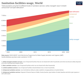 - ^ أ ب "Sanitation statistics". UNICEF. July 2023. Archived from the original on 22 May 2024. Retrieved 1 September 2024.