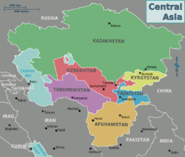 خريطة بلدان وسط آسيا (تشمل أفغانستان أحياناً)، بحر قزوين، وبلدان الجوار.