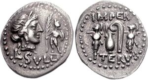Denarius issued ca. 84–83 BC under Sulla picturing Venus with a diadem and a standing Cupid with a palm branch, and on the reverse two military trophies and religious implements (jug and lituus)