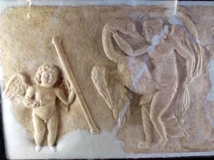 يمينLeda and the swan, with a Cupid in attendance (4th-century Roman relief)