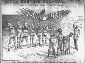 The war resulted in at least 200,000 Filipino civilian deaths, mostly from famine and diseases such as cholera.[19][20][21] Some estimates for civilian deaths reach up to a million.[10] War crimes were committed during the conflict by both sides,[22] including torture, mutilation, and summary executions of civilians and prisoners. In retaliation for Filipino guerrilla warfare tactics, the U.S. carried out reprisals and scorched earth campaigns and forcibly relocated many civilians to concentration camps, where thousands died.[23][24][25] The war and subsequent occupation by the U.S. changed the culture of the islands, leading to the rise of Protestantism, disestablishment of the Catholic Church, and the adoption of English by the islands as the primary language of government, education, business, and industry.[26] The U.S. annexation and war sparked political backlash from anti-imperialists in the U.S. Senate, who argued that the war was a definite example of U.S. imperialism, and that it was an inherent contradiction of the founding principles of the United States contained in the Declaration of Independence.[27][28][29]