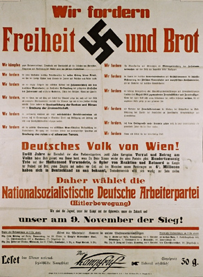 مجرد الدعاية لهذه الأفكار أو تنظيم الشعارات واستخدامها هي في ألمانيا والنمسا وبعض الدول الأخرى ممنوع قانونيا وتترتب عليه عقوبات قضائية الهزيمة في الحرب العالمية الأولى، معاهدة ڤرساي، أزمة الكساد الكبير، اتهام مراكز القوى المتمثلة في الديموقراطيون الاشتراكيون وحكومة ڤايمار ببيع ألمانيا، كل هذه الأحداث العصاب أدت إلى التفكير في ضرورة وجود حزب يعمل على اتحاد العمال، ورفع الاقتصاد من كبوته ورفع نسبة الشعور والانتماء الوطني للشعب الألماني بعدما أحبطته هزيمة الحرب العالمية الأولى، وعملت على تشكيل النواة الأولى للفكر العمالي الاشتراكي الألماني.