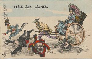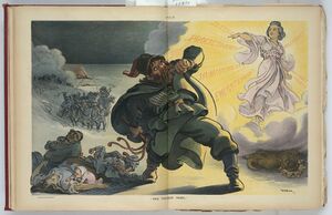 As his cousin, Kaiser Wilhelm knew that Tsar Nicholas shared his anti-Asian racism and believed he could persuade the Tsar to abrogate the Franco-Russian Alliance (1894) and then to form a German–Russian alliance against Britain.[49] In manipulative pursuit of Imperial German Weltpolitik "Wilhelm II's deliberate use of the 'yellow peril' slogan was more than a personal idiosyncrasy, and fitted into the general pattern of German foreign policy under his reign, i.e. to encourage Russia's Far Eastern adventures, and later to sow discord, between the United States and Japan. Not the substance, but only the form, of Wilhelm II's 'yellow peril' propaganda disturbed the official policy of the Wilhelmstrasse."[50]