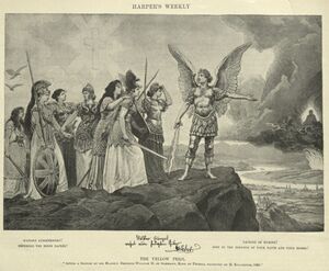 To justify European cultural hegemony, the Kaiser used the allegorical lithograph Peoples of Europe, Guard Your Most Sacred Possessions (1895), by Hermann Knackfuss, to communicate his geopolitics to other European monarchs. The lithograph depicts Germany as the leader of Europe,[11][16] personified as a "prehistoric warrior-goddesses being led by the Archangel Michael against the 'yellow peril' from the East", which is represented by "dark cloud of smoke [upon] which rests an eerily calm Buddha, wreathed in flame".[17][18] Politically, the Knackfuss lithograph allowed Kaiser Wilhelm II to believe he prophesied the imminent race war that would decide global hegemony in the 20th century.[17]