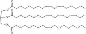Representative triglyceride found in a drying oil. The triester is derived from three different unsaturated fatty acids, alpha-linoleic (top), linolenic (middle), and oleic acids (bottom). The order of drying rate is linolenic > linoleic > oleic acid, reflecting their degree of unsaturation.