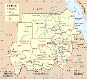 السودان، رسمياً جمهورية السودان، هي جمهورية عربية في وادي النيل شمال أفريقيا، تحدها مصر من الشمال، البحر الأحمر، إرتريا وإثيوپيا من الشرق، جنوب السودان من الجنوب، جمهورية أفريقيا الوسطى من الجنوب الغربي، تشاد من الغرب وليبيا من الشمال الغربي. يقسم نهر النيل البلاد إلى نصفين شرقي وغربي.[10] يدين أغلبية السودانيين بالإسلام.[11]