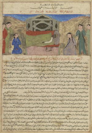 Muhammad Tapar was succeeded by his son Mahmud II (ح. 1118–1131), who ruled over western Persia and (nominally) Iraq, but he faced many claimants. Sanjar, who held Khorasan since 1097, was generally recognized as the head of the Seljuk family.[46] The Nizaris maintained peaceful or friendly relations with Sanjar. According to Juwayni, Sanjar was prompted into these good ties after Hassan-i Sabbah had a eunuch place a dagger beside Sanjar's bed while he was asleep. Several manshurs (decrees) by Sanjar are recorded in the library of Alamut, in which the sultan had conciliated the Nizaris. Sanjar reportedly paid the Nizaris an annual of 3,000–4,000 dinars from taxes of Qumis and allowed them to levy tolls from the caravans passing beneath Girdkuh on the Khurasan Road. The peaceful final years of Hassan-i Sabbah, which were mostly spent consolidating the Nizari position, including the recapture of strongholds in Rudbar that had been lost in Shirgir's campaign, as well as intensifying the da'wa in Iraq, Adharbayjan, Gilan, Tabaristan, and Khurasan, is partly attributed to the Nizari ties with Sanjar.[47] Some Nizaris joined Sanjar's forces in his invasion of Mahmud II's territories in 1129. Mahmud II was defeated in Sawa and most of northern Persia, including Tabaristan and Qumis, which was penetrated by the Nizaris, came under Sanjar's rule. Mahmud II's brother, Tughril, later rebelled and took Gilan, Qazvin, and other districts.[46]