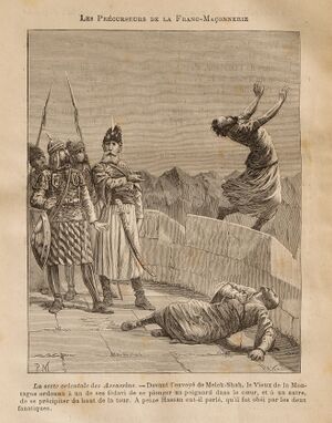 According to medieval Western legends, the Old Man of the Mountain (i.e. Hassan-i Sabbah) ordered a fida'i to stab himself and another one to throw himself off the Alamut's walls, convincing Sultan Malikshah's envoy that his men embrace death. 19th-century drawing by Pierre Méjanel, from Les Mystères de la Franc-Maçonnerie (1886) of Léo Taxil.