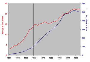 In 1950 coal supplied half of Japan's energy needs, hydroelectricity one-third, and oil the rest. In 1988 oil provided Japan with 57.3% of energy needs, coal 18.1%, natural gas 10.1%, nuclear power 9.0%, hydroelectic power 4.6%, geothermal power 0.1%, and 1.3% came from other sources. By 2001 the contribution of oil had declined further to 50.2% of the total, with further rises in the use of nuclear power and natural gas.[10]