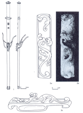 Archaeological excavations of Roman ruled Chatalka (an area in modern day Bulgaria) uncovered several swords and other weapons buried inside tombs. These swords include Han Dynasty style swords and scabbards with nephrite-jade scabbard slides adorned with Chinese dragon motifs. [146]