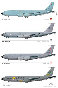 Paint scheme of a Turkish Air Force Boeing KC-135R-CRAG Stratotanker compared to other KC-135 variants used by France, Singapore and the United States.
