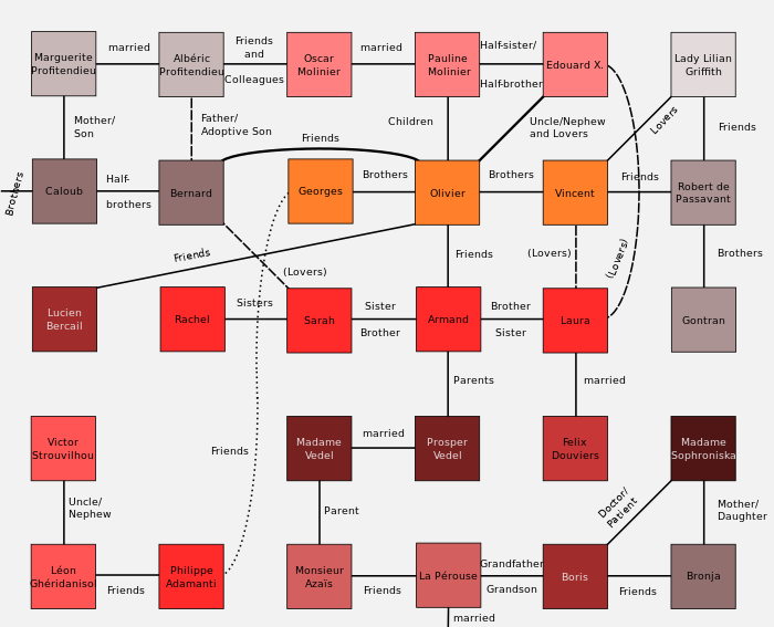 As the novel unfolds, many different characters and plotlines intertwine. This social network graph shows how the most important characters in The Counterfeiters are related to each other: