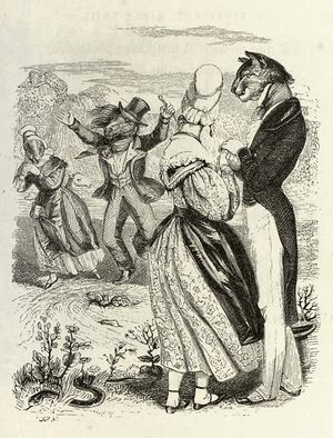 Slightly earlier than L'Estrange's translation, there was an amplified version of the story in La Fontaine's Fables under the title "The torrent and the river" (Le torrent et la rivière, VIII.23). It tells of a man trying to escape a robber who easily fords a turbulent stream but drowns in a smooth-flowing river, ending on the caution that 'Silent folk are dangerous'.[6] The French proverb that is the nearest equivalent to the English 'still waters run deep' also emphasizes this danger: 'no water is worse than quiet water' (Il n’est pire eau que l’eau qui dort). When the caricaturist J. J. Grandville illustrated La Fontaine's fable, he further underlined this meaning by transposing it into a seduction scene. In the background a capering donkey and a shrew are advancing along the road, watched by a woman whose hands are clasped by a sleek cat. Unnoticed at her feet, a snake is slithering through the grass.