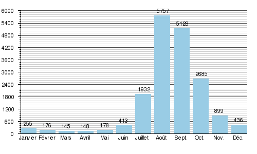 متوسط التدفق الشهري (م³/ث) مقاساً عند المحطة الهيدرولوجية في الخرطوم- لحوض: 325,000 كم²- بيانات مسجلة للفترة 1900-1982[1]