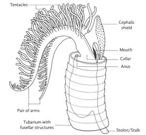 A mature zooid has three important regions, the preoral disc or cephalic shield, the collar and the trunk. In the collar, the mouth and anus (U-shaped digestive system) and arms are found; Graptholitina has a single pair of arms with several paired tentacles. As a nervous system, graptolites have a simple layer of fibers between the epidermis and the basal lamina, also have a collar ganglion that gives rise to several nerve branches, similar to the neural tube of chordates.[7] Proper fossils of the soft parts of graptolites have yet to be found, and it is not known if they had pharyngeal gill slits or not,[8] but based on extant Rhabdopleura, it is likely that the grapotlite zooids had the same morphology.[4]