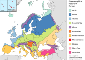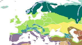 خريطة لاستخدام أراضي أوروپا حيث الأراضي الصالحة للزراعة (بالأصفر)، الغابات (بالأخضر الداكن)، الحشائش (بالأخضر الفاتح)، التندرا في الشمال (بالأصفر الداكن).